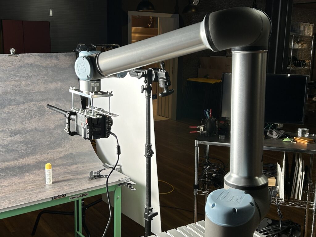 このロボットアームは、動きに対する精度がもの凄く高く、同じスピード、同じ動作を行う事が出来るので、撮影に精度が求められるカット割りや、今まで見た事のない映像の撮影が可能になる、まさに新しいスタイルの撮影手法になっています。