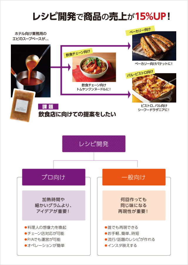 料理のプロ集団として「商品を売る」ためのレシピを提案し、クライアント様の要望に応えられる体制を整えております。